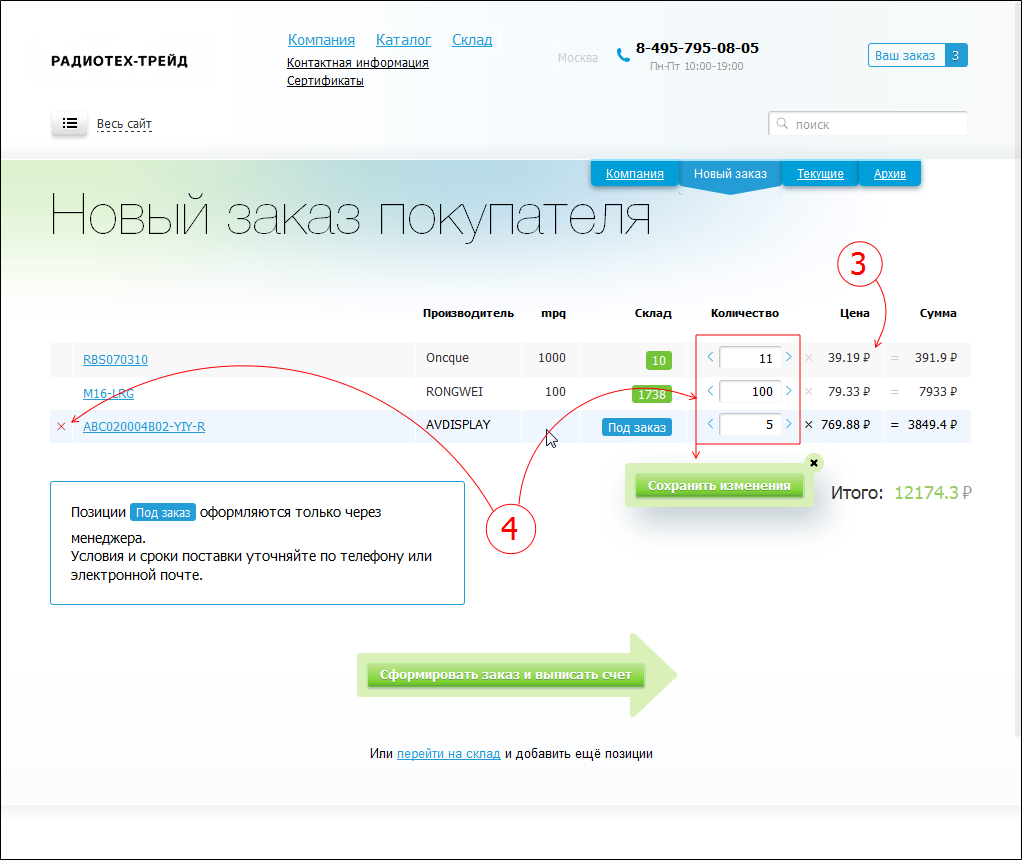 Также здесь вы можете добавлять, удалять товары и менять их кол-во (4).