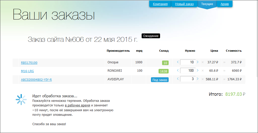 Заказ отправлен. Обработка заказа производится только в рабочее время и занимает ~5 минут, после её завершения вам на электронную почту придет оповещение.