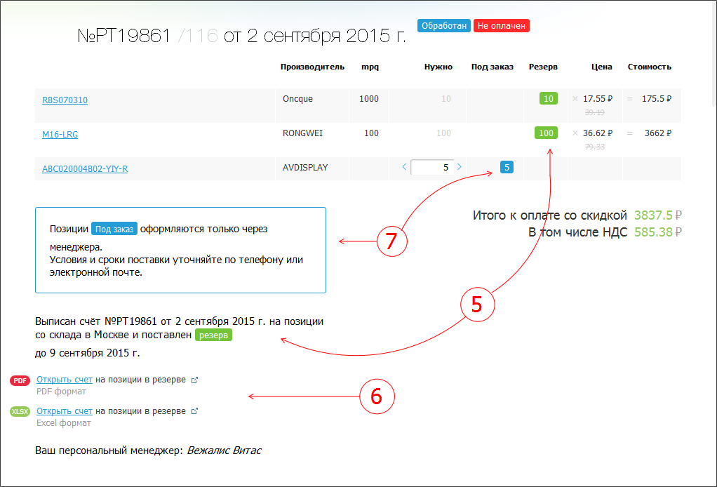 Выставлен счет ТОЛЬКО на позиции в резерве (6). Срок резерва явно отображается в заказе. Копия заказа и файл счета отправлены вам на электронную почту.