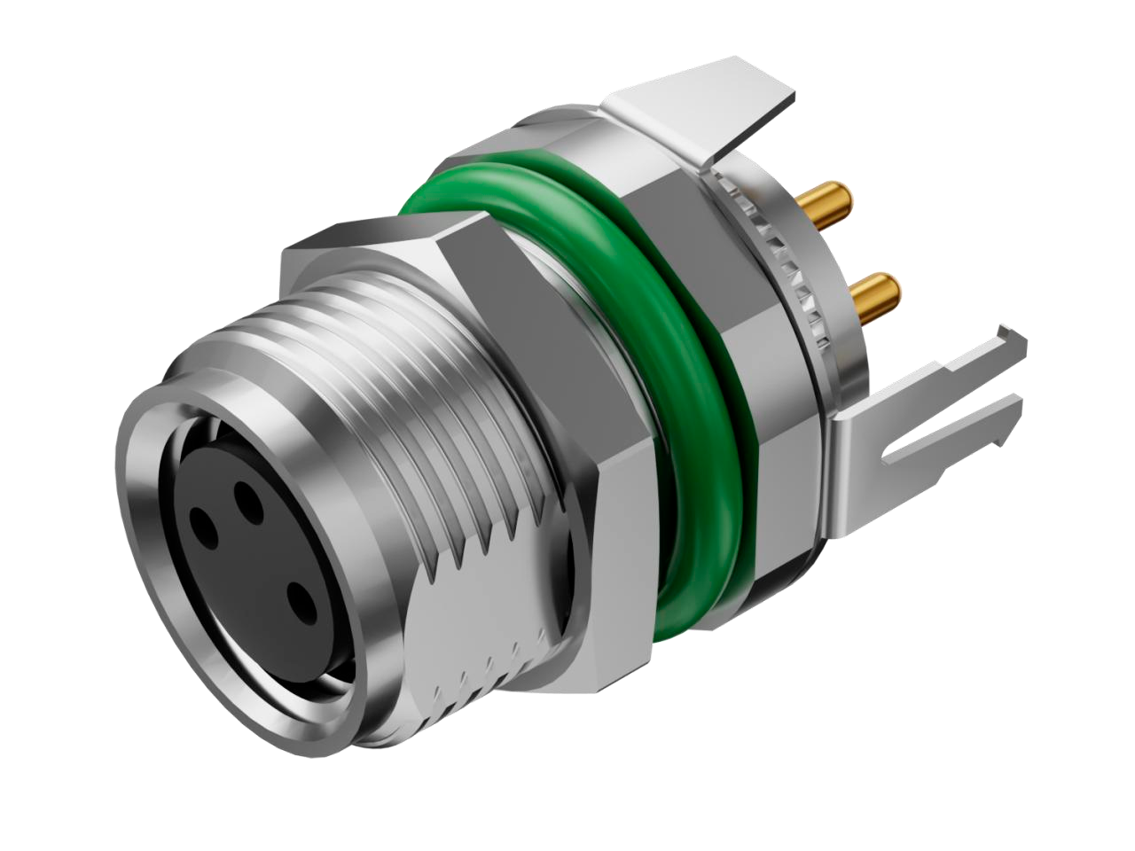 M8 розетка блочная прямая на плату экранир., код A, 3 конт., гайка M10x0.75 спереди, резьба латунь никелиров. / M08A03FBRB1P1001