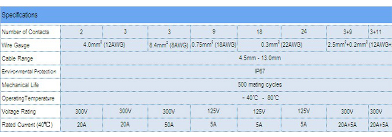 Серия Large: Панельная розетка, контакты вилка и розетка, вилка и розетка на кабель, передняя гайка, контакты под пайку, резьбовое соединение, соединение push-lock, заглушки; силовые и сигнальные контакты в одном корпусе, от 2 до 15 контактов, защита IP-67.